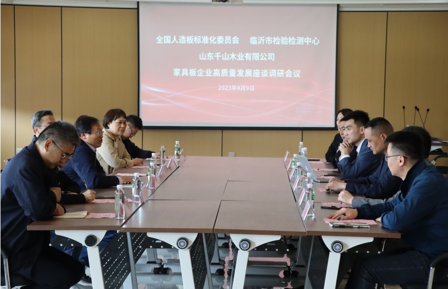 4月9日下午,全國人造板標準化技術委員會副主任兼秘書長研究員段新芳,副秘書長李曉玲,臨沂市檢驗檢測中心黨組書記、主任劉愛友,黨組成員、副主任黃波,市檢驗檢測中心質檢所所長竇興霞及相關專業技術人員蒞臨千山木業進行調研。 領導一行先后參觀了千山新建自動化生態板生產車間、高標準成品庫、國內先進的浸漬膠膜紙飾