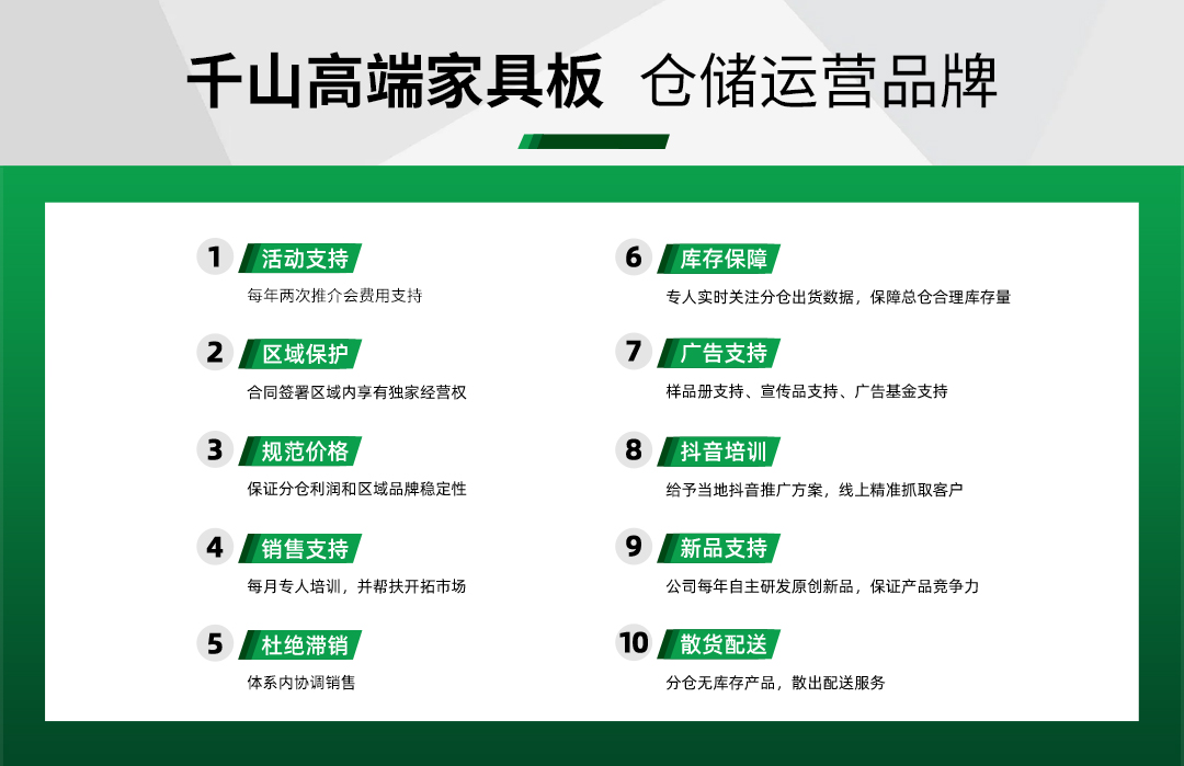 “讓更多家庭擁有健康生活”是千山始終不變的初心與使命。在如今的新趨勢下,千山將繼續專注品質追求,不斷技術創新,提升服務質量,并積極擁抱更多的合作伙伴。2022千山家具板倉儲全國招商正式開啟,誠邀加盟!